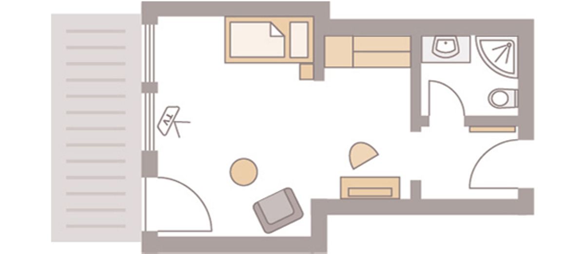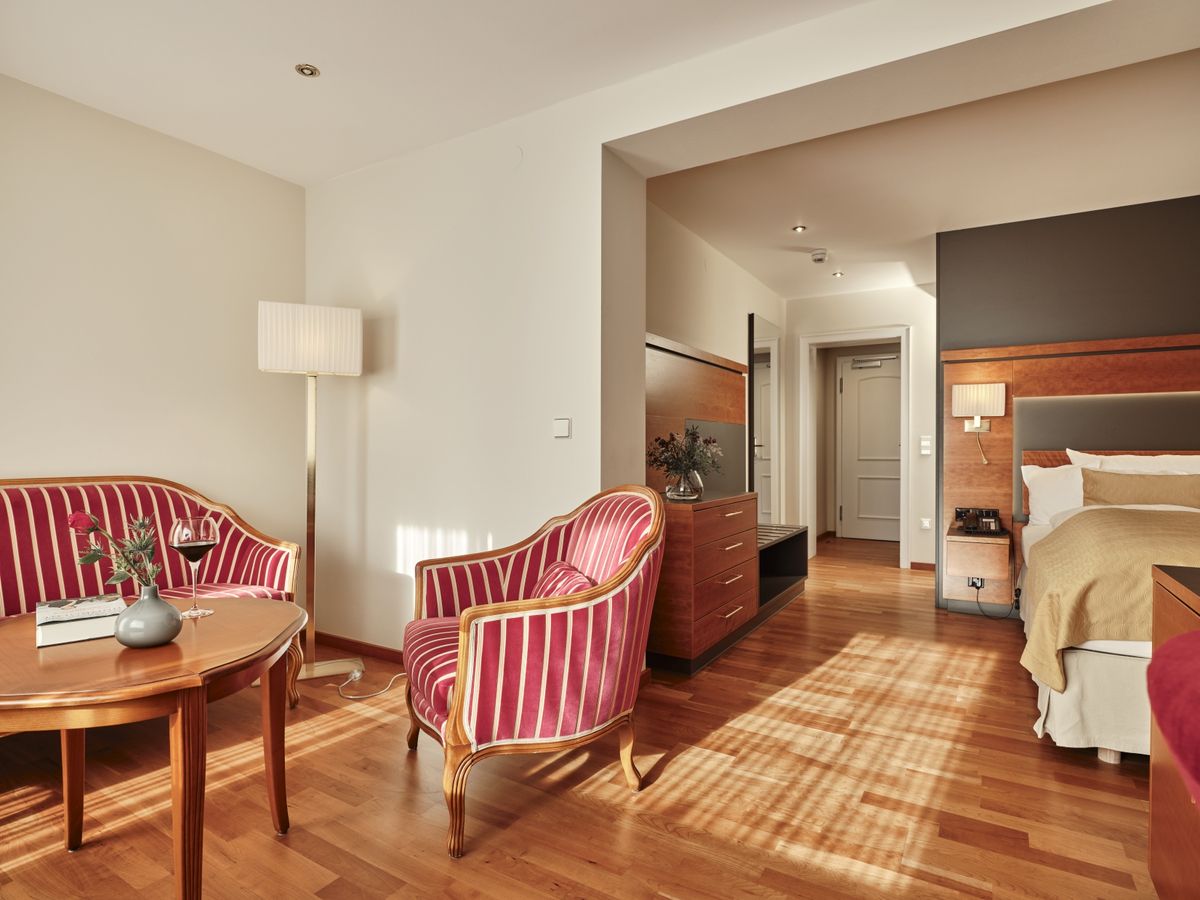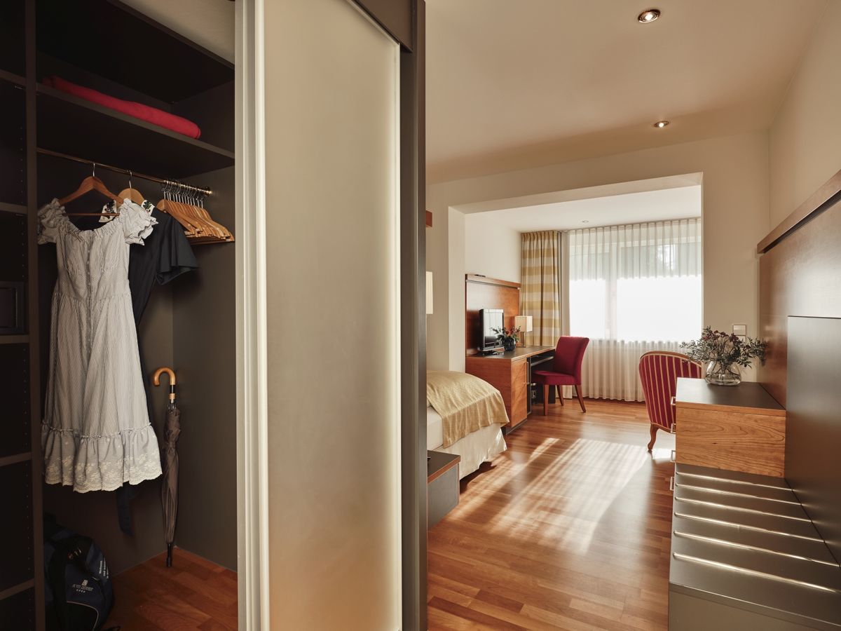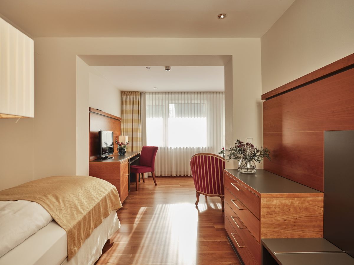36 m² großes Nichtraucher-Einzelzimmer mit Schlaf- und Wohnteil ist mit WC und Dusche und beleuchtetem Kosmetikspiegel ausgestattet. Flat-Screen mit Sat-TV, Internetanschluss mit W-Lan und Lan kostenfrei, Minibar, Radio, Safe, Schreibtisch, Sitzgelegenheit, Telefon, Weckeinrichtung. Zimmer mit Südbalkon. Keine Tiere Bettgröße: 100 cm x 200 cm