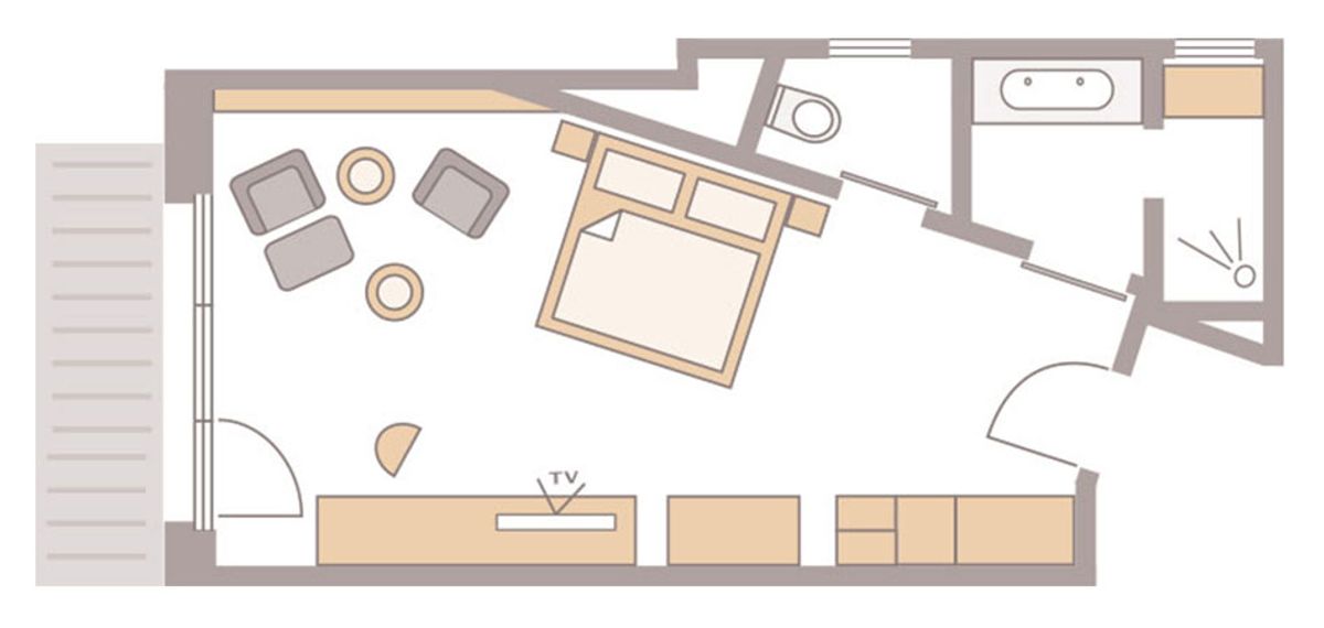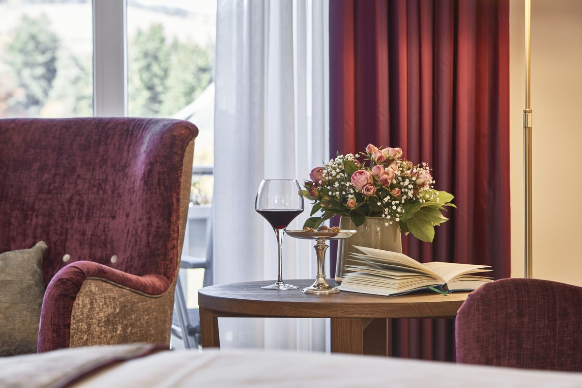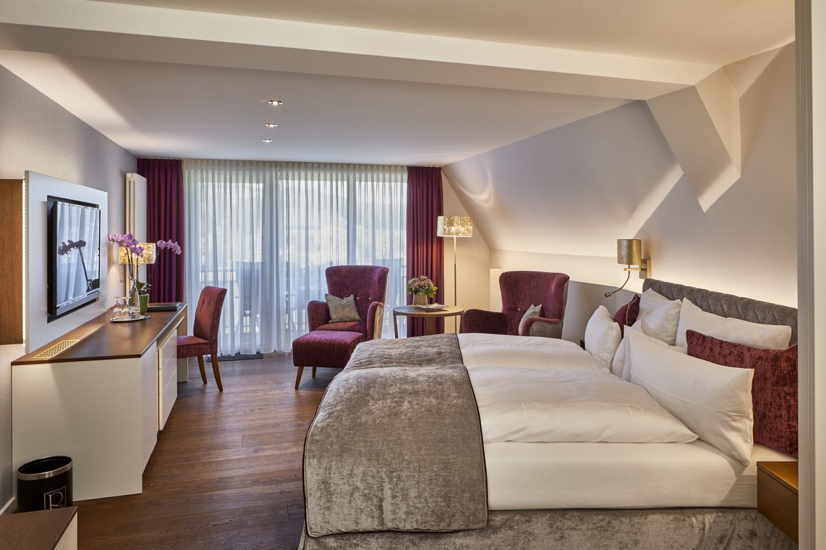 35m² großes Nichtraucherdoppelzimmer ist mit WC und Dusche und Doppelwaschbecken und beleuchtetem Kosmetikspiegel ausgestattet. Bettgröße 1.80 m x2.00 m mit getrennten Matratzen. Flat-Screen mit Sat-TV, Internetanschluss mit W-Lan und Lan kostenfrei, Minibar, Radio, Safe, Schreibtisch, Sitzgelegenheit, Telefon, Westbalkon zur Kirchenwiese .Bodentiefe Fenster. Keine Tiere