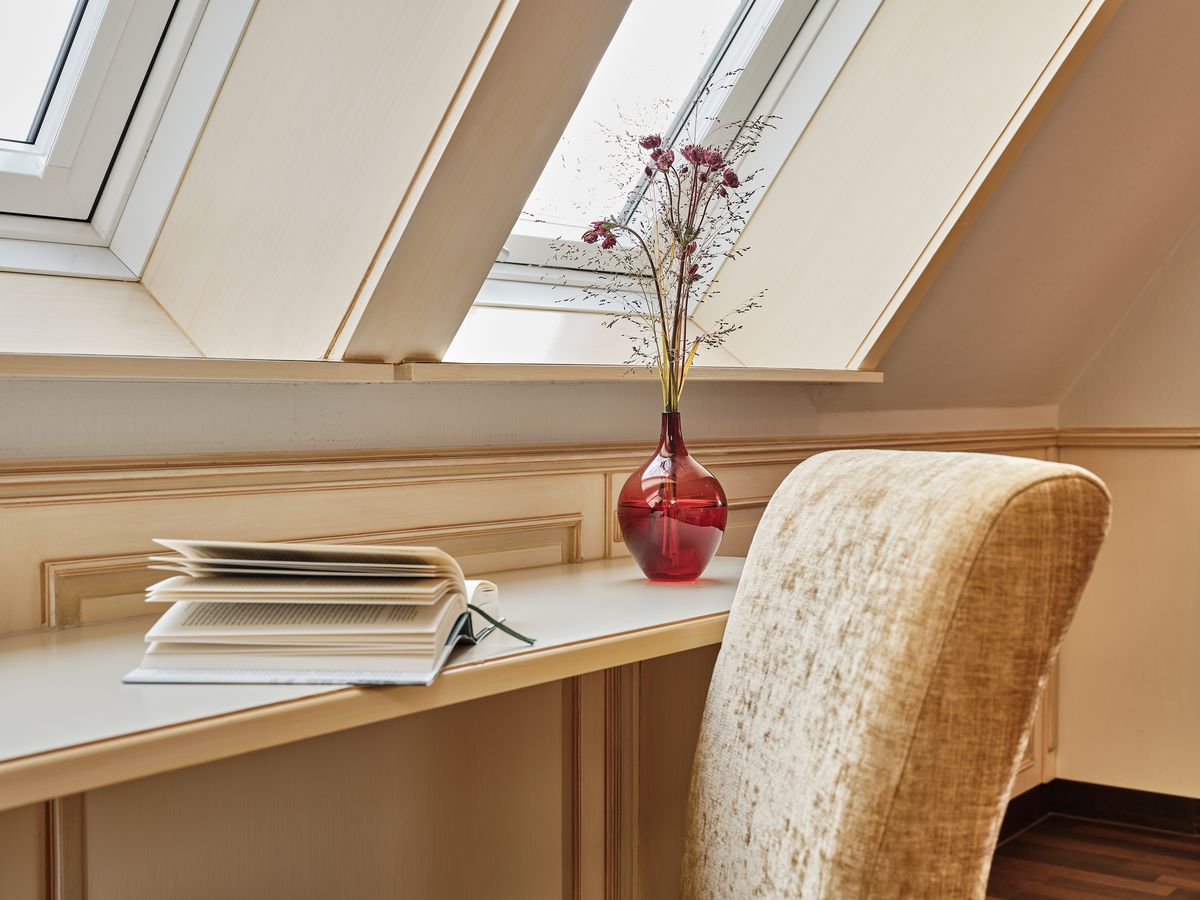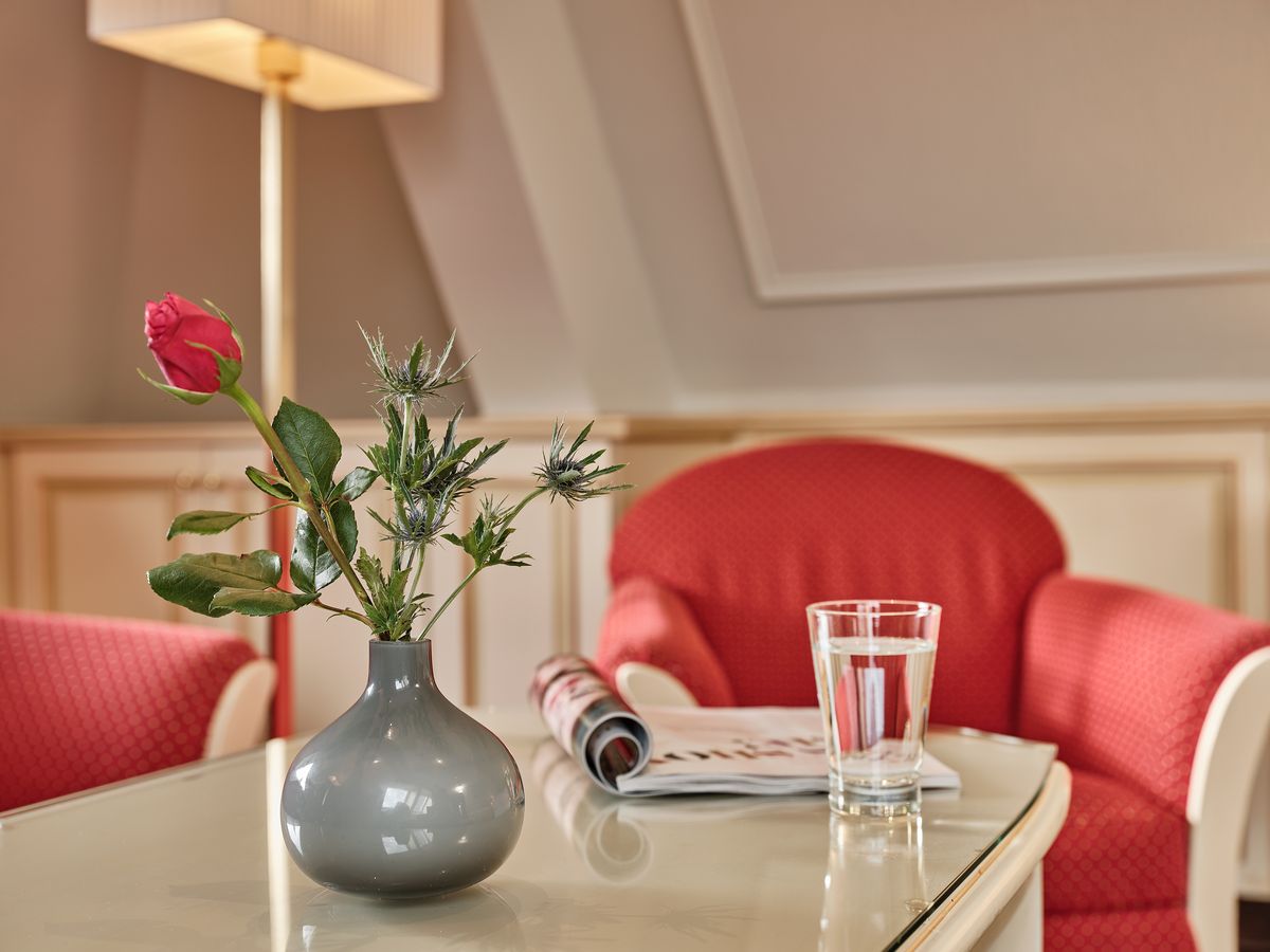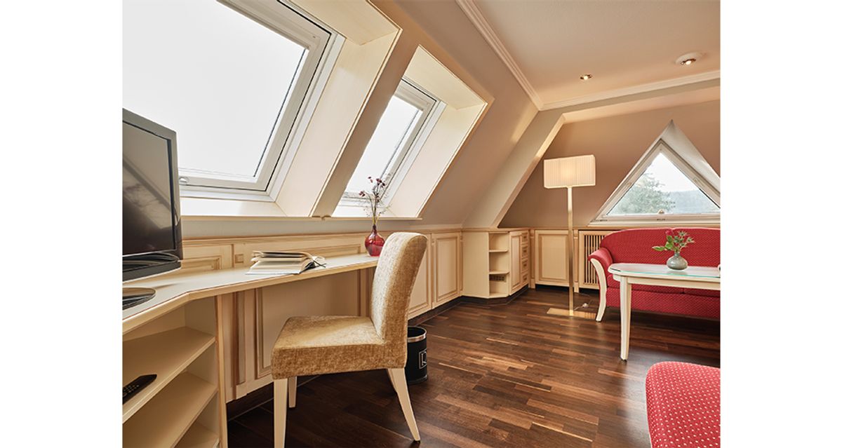 36 m² großes Nichtraucher-Doppelzimmer mit WC und Dusche und beleuchtetem Kosmetikspiegel ausgestattet. TV, Internetanschluss mit W-Lan und Lan kostenfrei. Minibar, Radio, Safe, Schreibtisch, Sitzgruppe, Telefon, Weckeinrichtung. Die Zimmer verfügen teilweise über Dachschräge und Vorraum. Neues Design mit Eichenparkett. Keine Tiere Bettgröße: 180 cm x 200 cm