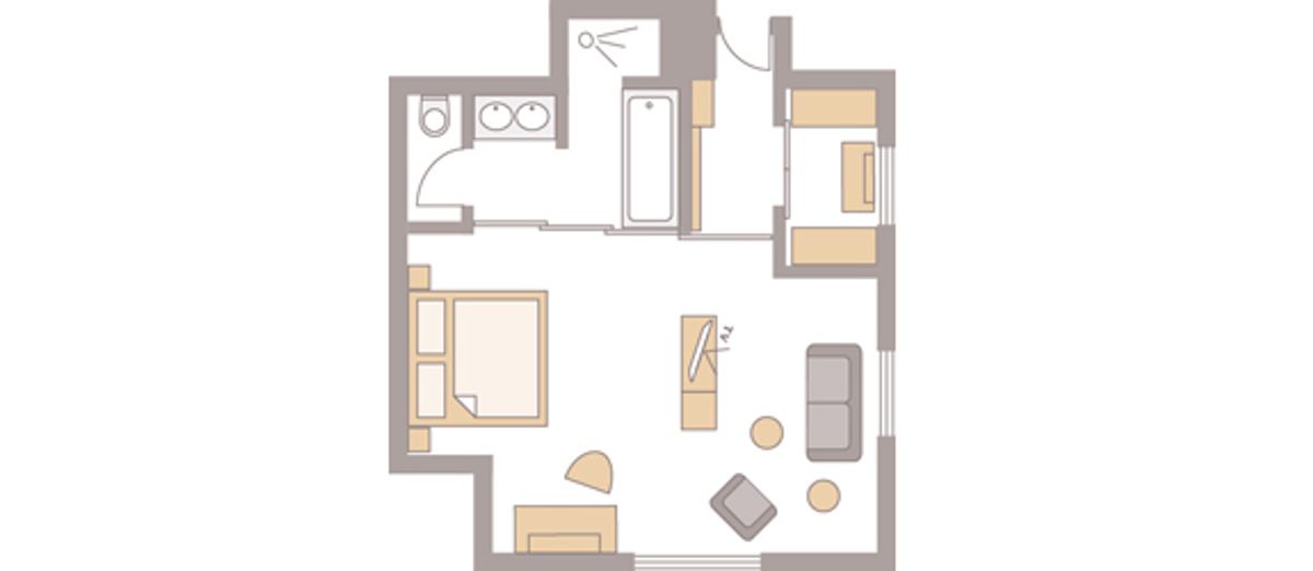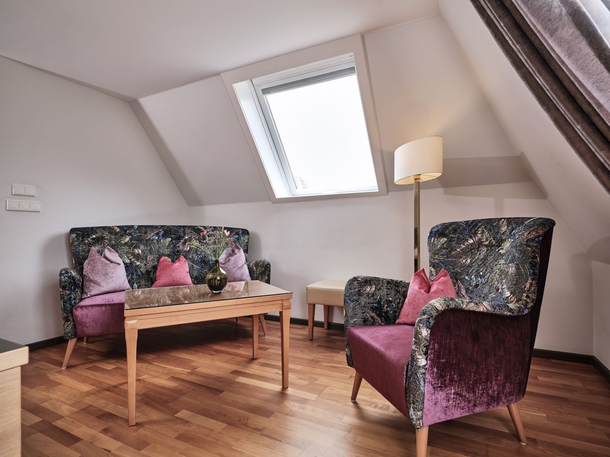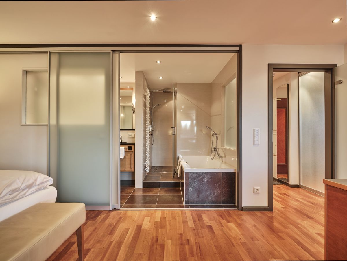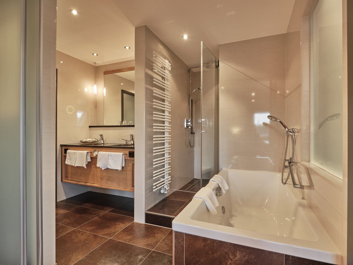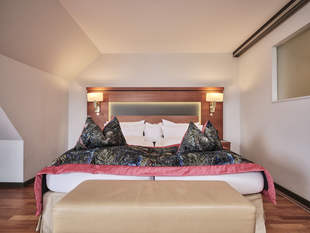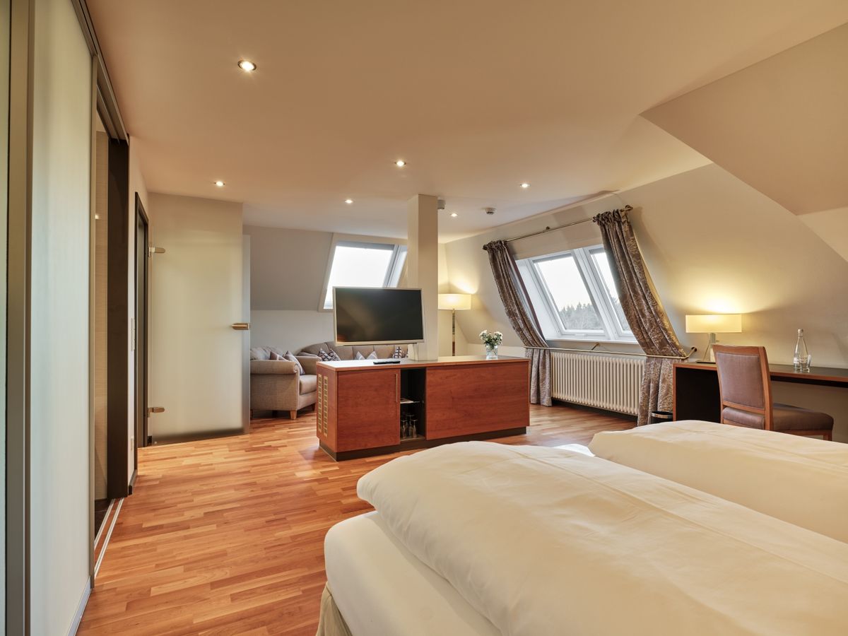 45 m² großes Nichtraucher-Doppelzimmer ist mit Dusche, Panoramabad, abgetrenntem WC, beleuchtetem Kosmetikspiegel, Doppelwaschbecken und Kirschholzboden ausgestattet. Begehbarer Kleiderschrank. Schwenkbarer Flat-Screen mit Sat-TV, Internetanschluss mit W-Lan und Lan kostenfrei, Minibar, Radio, Safe, Schreibtisch, Sitzgruppe, Telefon, Weckeinrichtung. Keine Tiere
