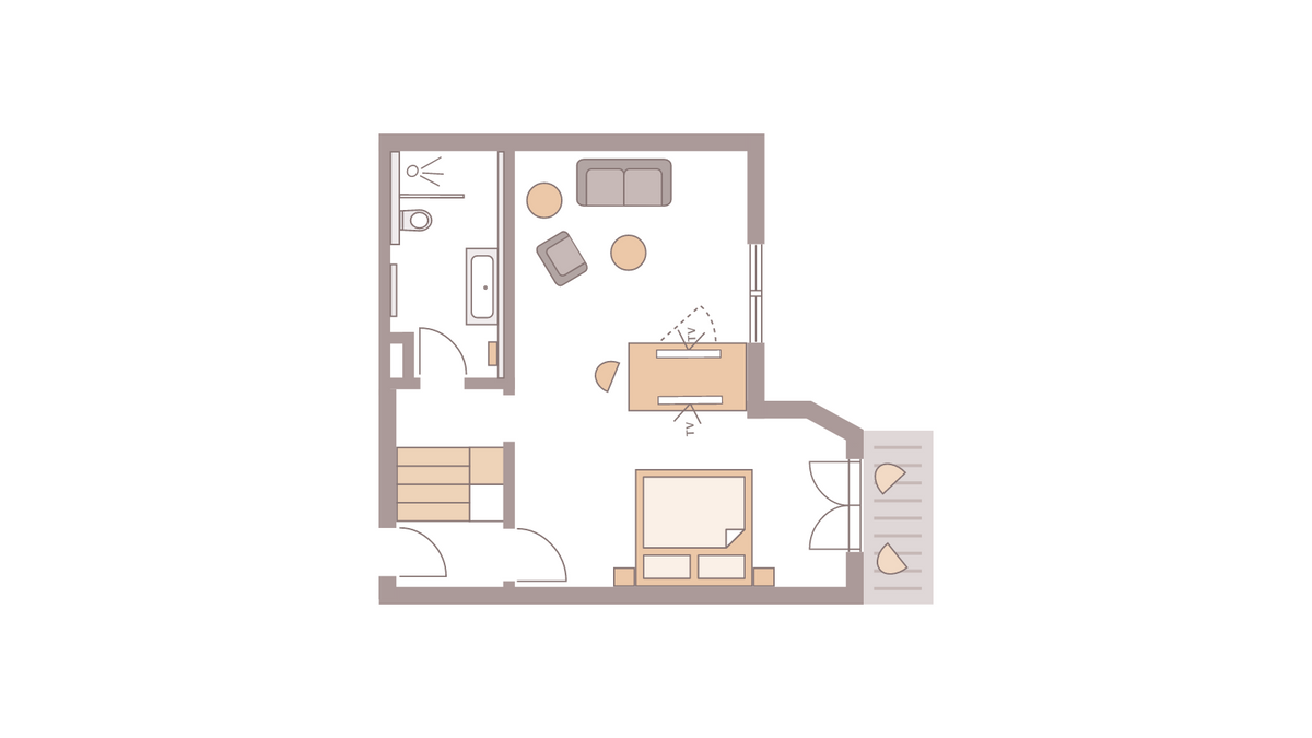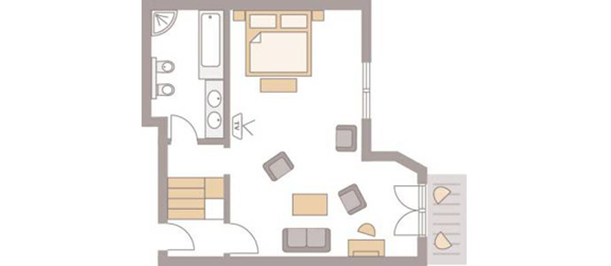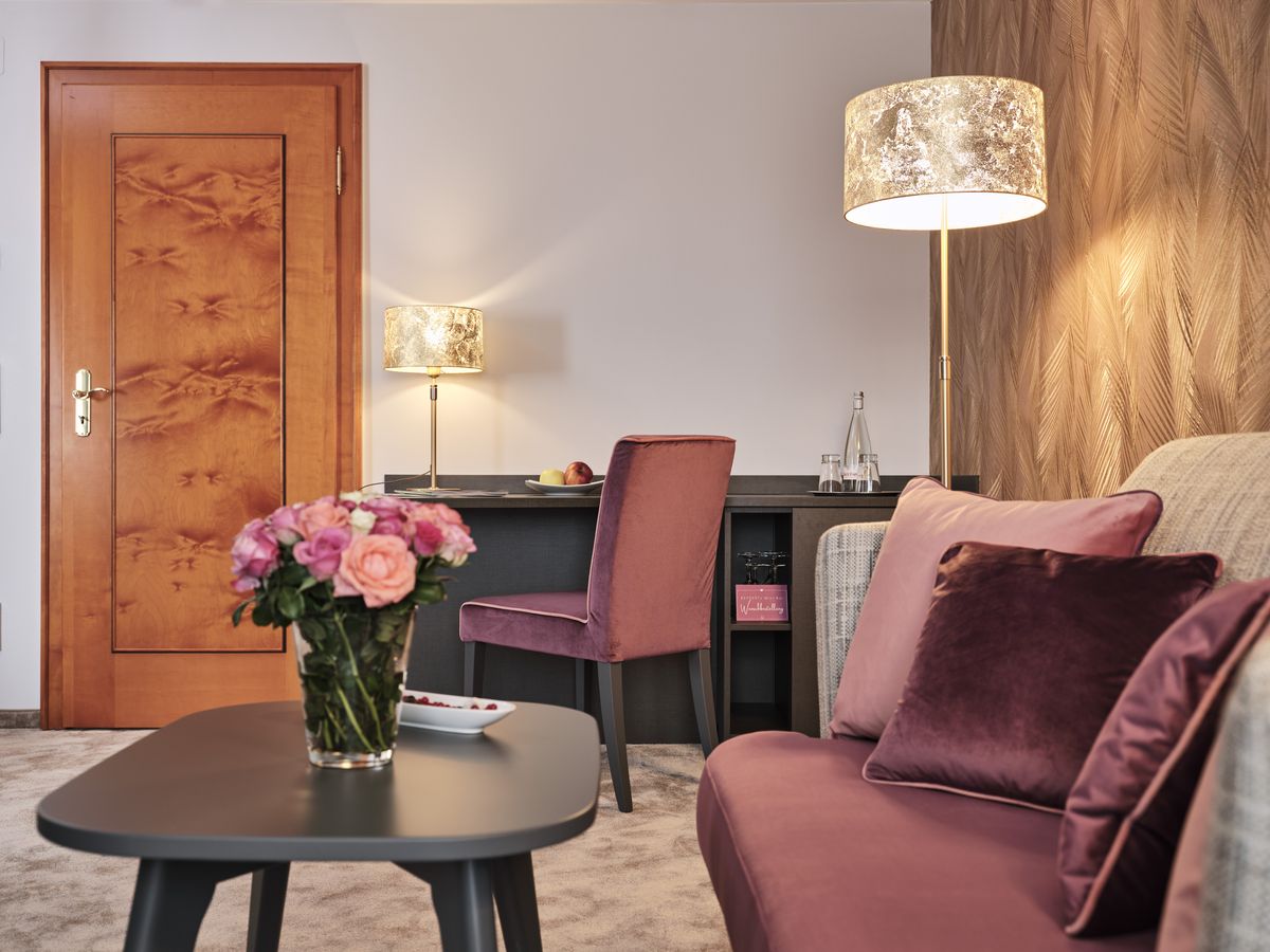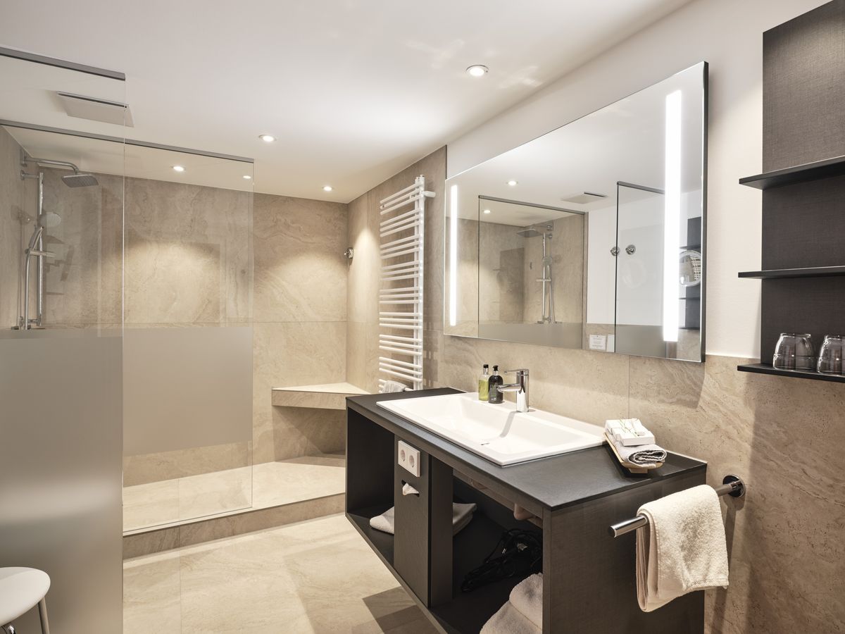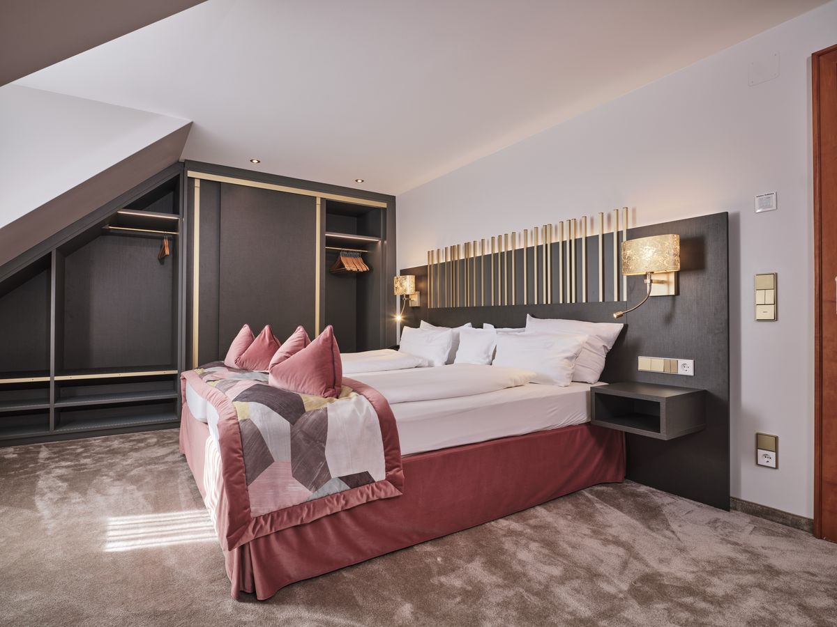 WC und komfortabler Dusche , großem Waschbecken und beleuchtetem Kosmetikspiegel ausgestattet. 2 Flat Screen mit Sat-TV, Internetanschluss mit W-Lan und Lan kostenfrei, Minibar, Radio, Safe, Schreibtisch, Sitzggruppe, Telefon, Weckeinrichtung. Die Zimmer verfügen über eine Dachneigung. Das Zimmer befindet sich in der 2. Etage, Balkon zu Weiherseite nach Osten.