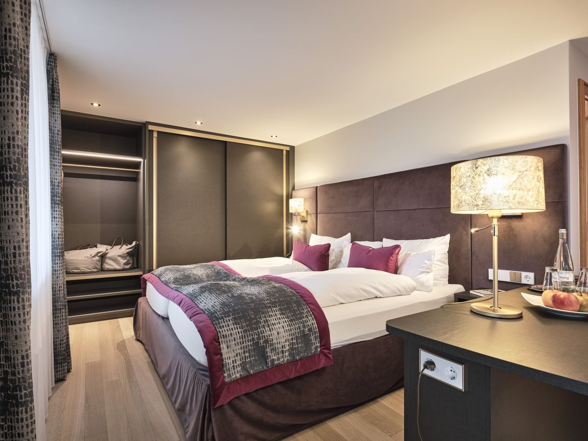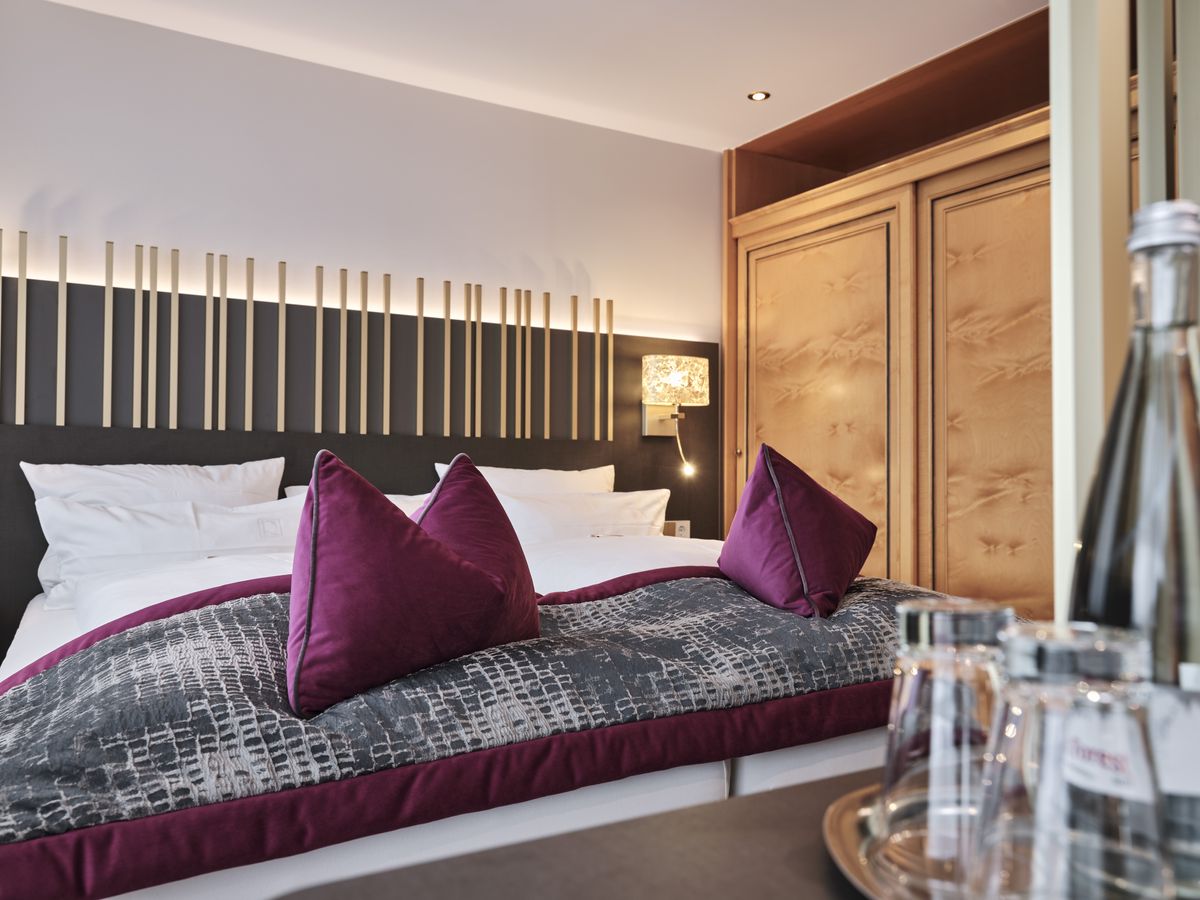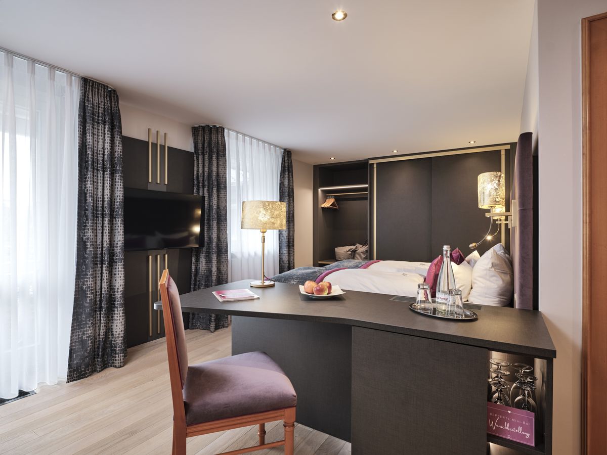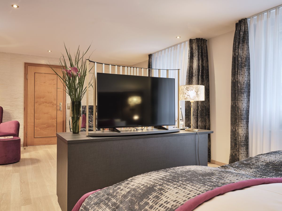 48 m² großes Doppelzimmer mit Dusche, Doppelwaschbecken, WC. modernes Design min Wohlfühlfarben mit Eichenboden / Teppichboden. Minibar, Sat-TV, Radio, kostenfreies W-Lan, Safe, Telefon, Schreibtisch sowie eine bequeme und großzügige Sitzgelegenheit. Der Westbalkon zeigt zur Kirchwiese. Teilweise Stufen ins Badezimmer. Keine Tiere Bettgröße: 200 cm x 210 cm