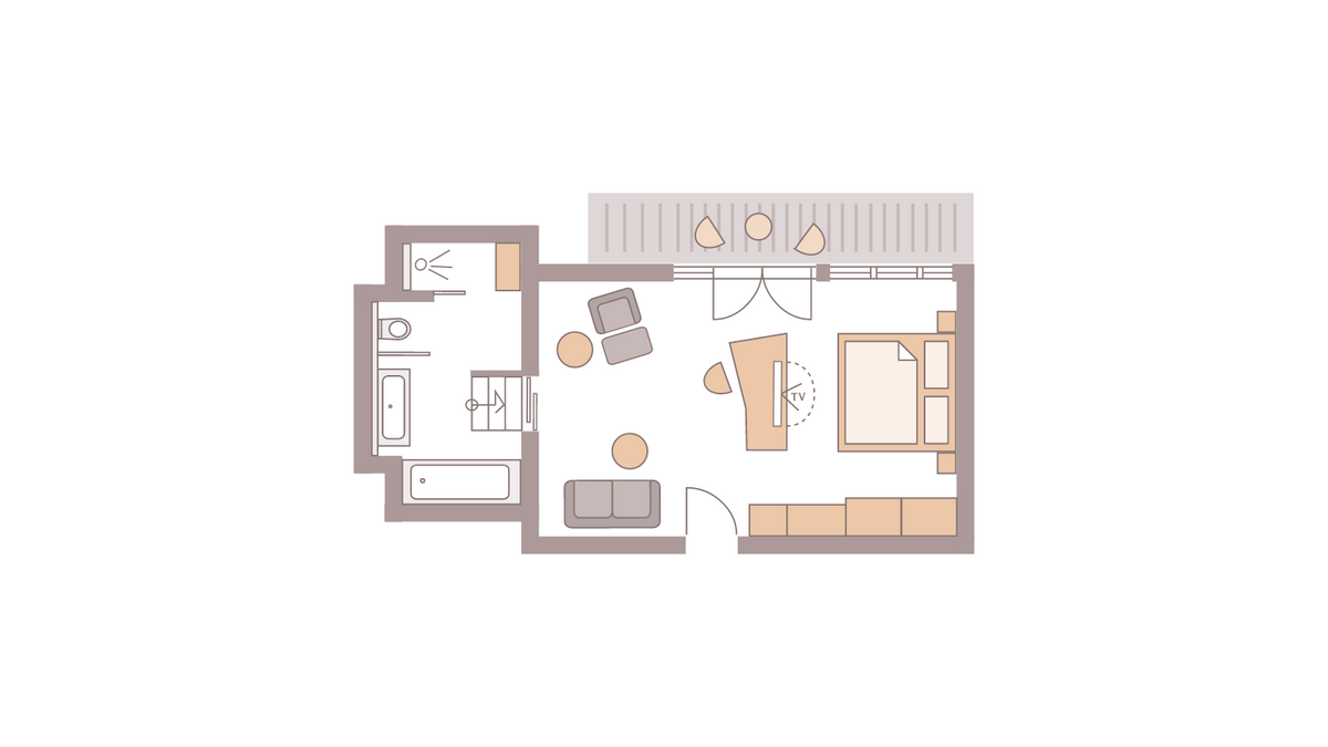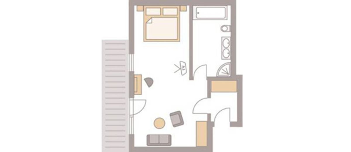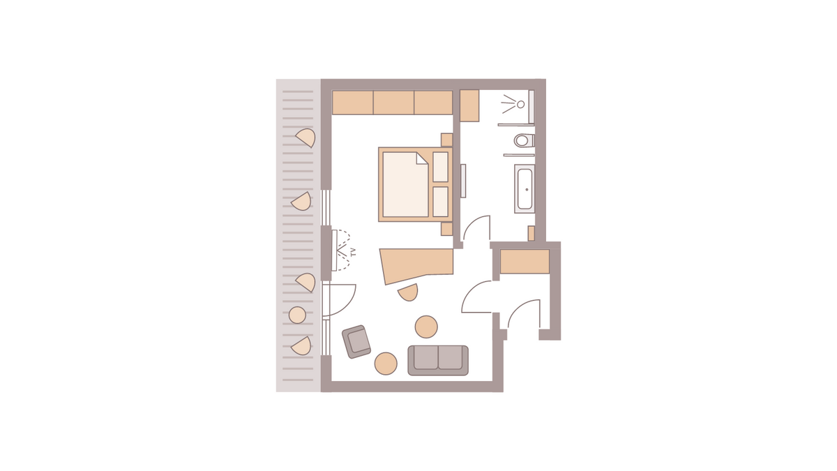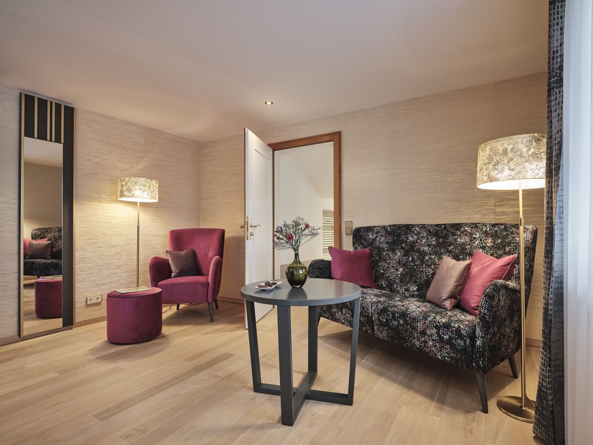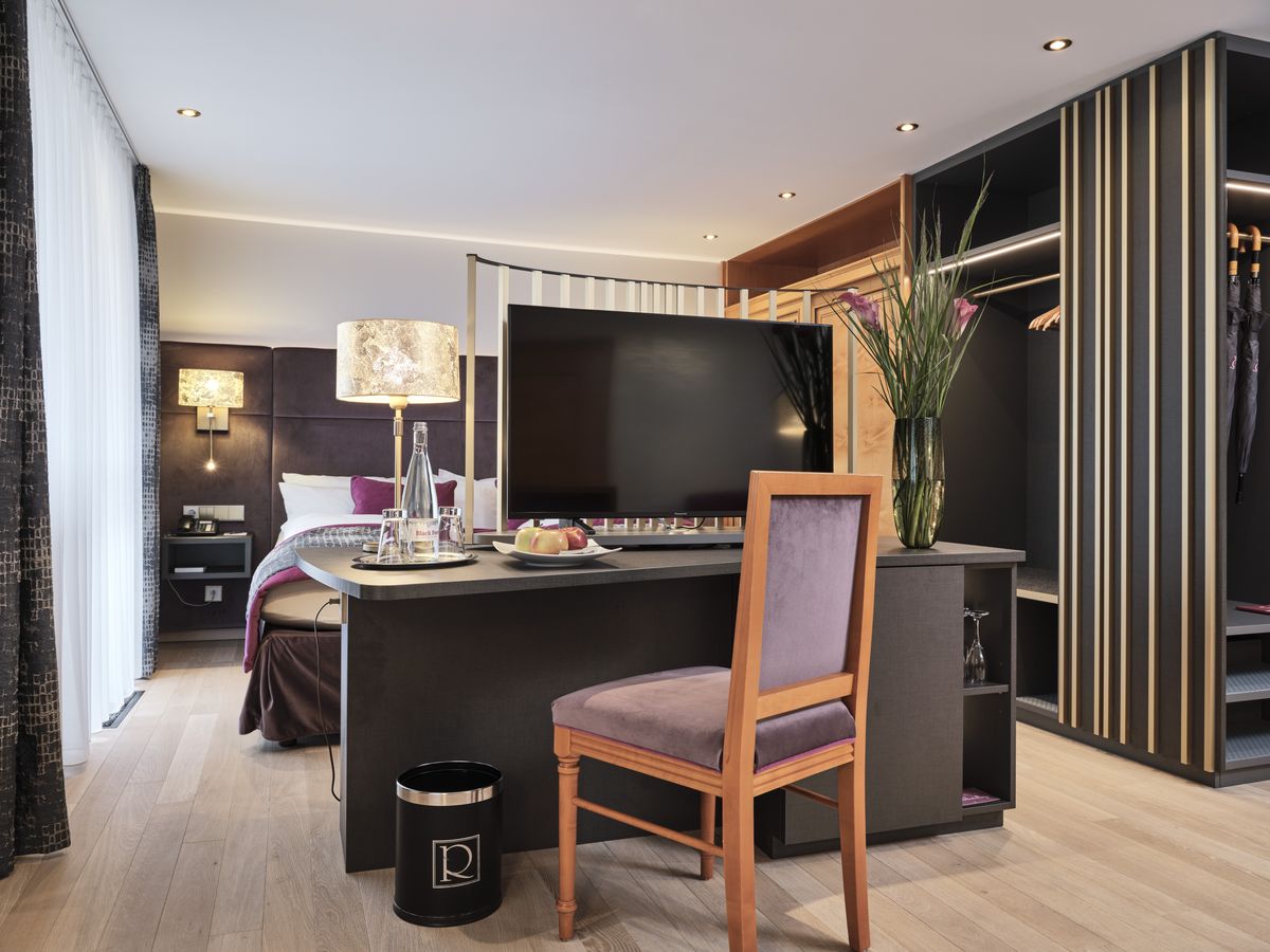 48 m² großes Doppelzimmer mit Dusche, Doppelwaschbecken, WC. modernes Design min Wohlfühlfarben mit Eichenboden / Teppichboden. Minibar, Sat-TV, Radio, kostenfreies W-Lan, Safe, Telefon, Schreibtisch sowie eine bequeme und großzügige Sitzgelegenheit. Der Westbalkon zeigt zur Kirchwiese. Teilweise Stufen ins Badezimmer. Keine Tiere Bettgröße: 200 cm x 210 cm