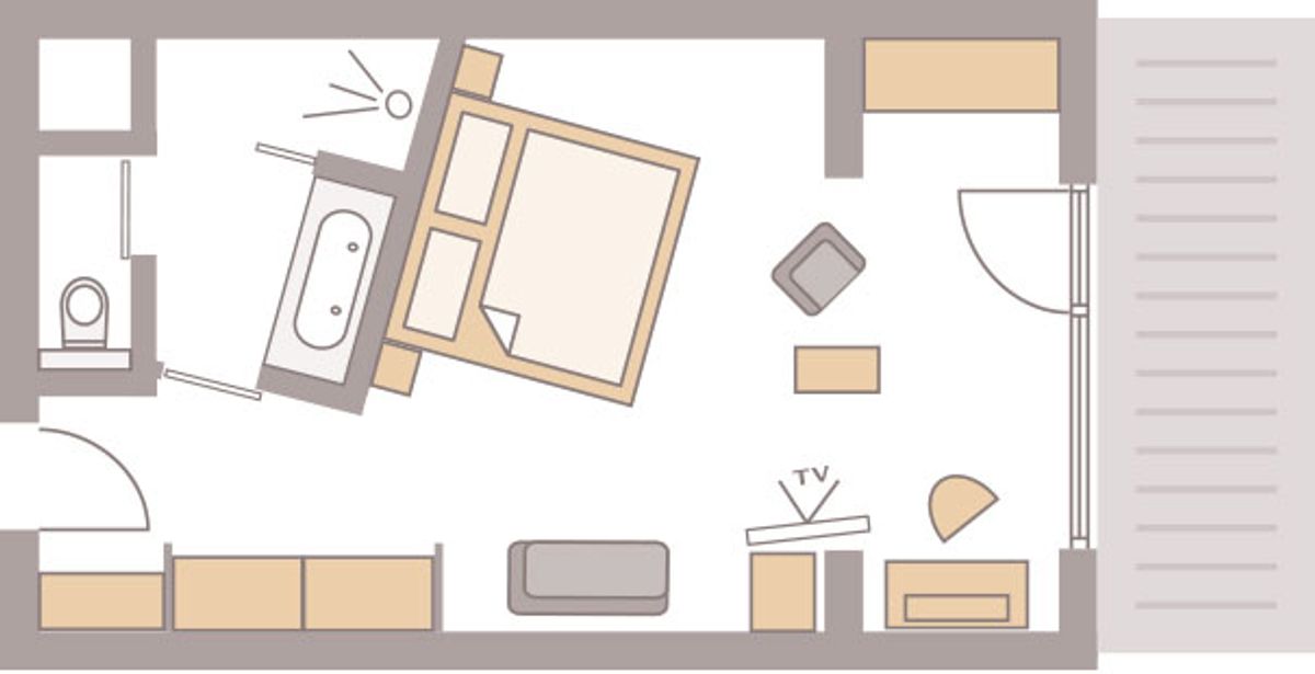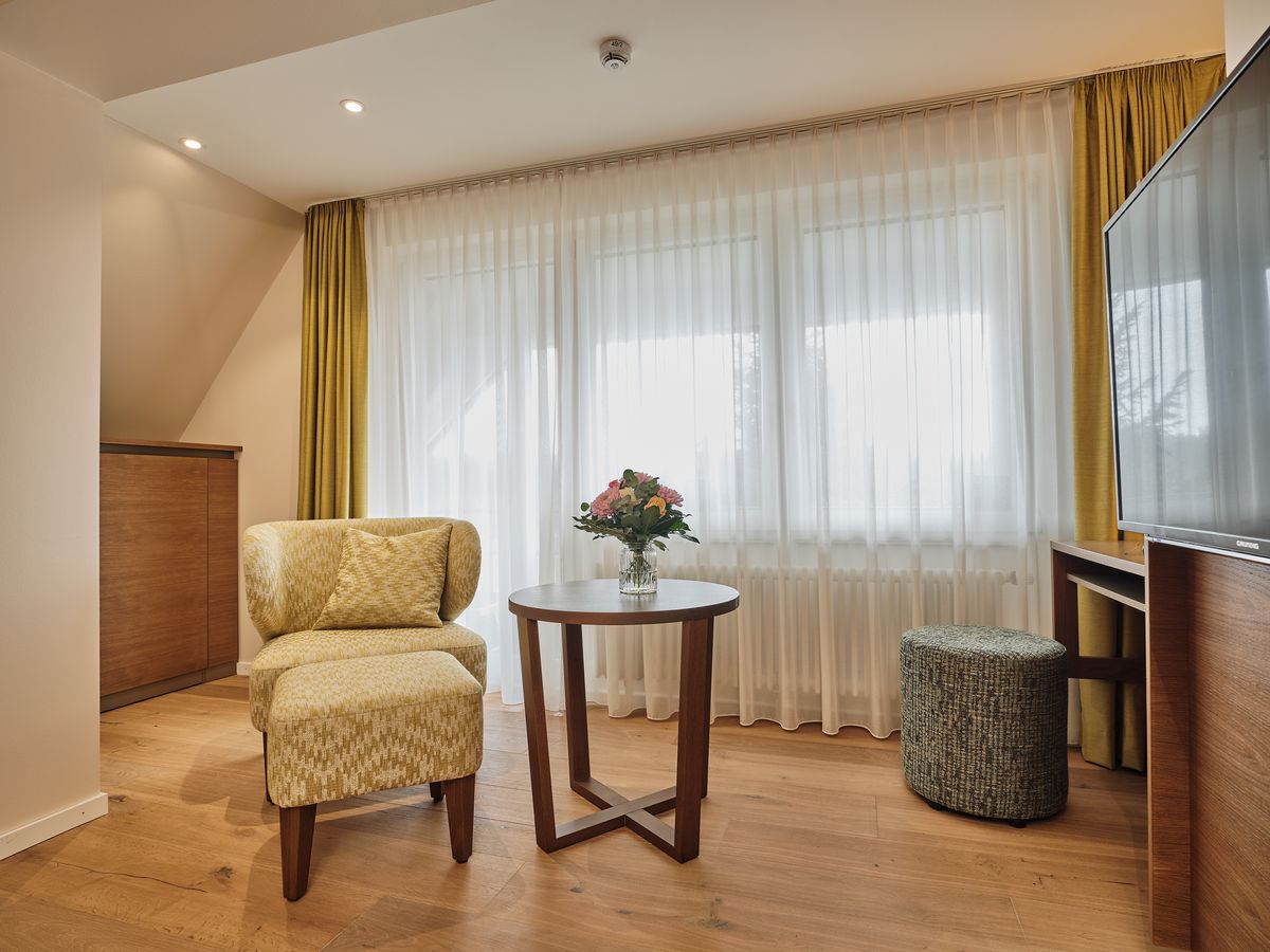 39 m² großes Nichtraucherdoppelzimmer, Holzfußboden, Dusche, WC separat und beleuchtetem Kosmetikspiegel ausgestattet. Flat-Screen mit Sat-TV, Internetanschluss mit W-Lan und Lan kostenfrei, Minibar, Radio, Safe, Schreibtisch, Sitzgruppe, Telefon, Weckeinrichtung. Balkon zur Adlerweiherseite nach Osten Bettgröße: 180 cm x 200cm