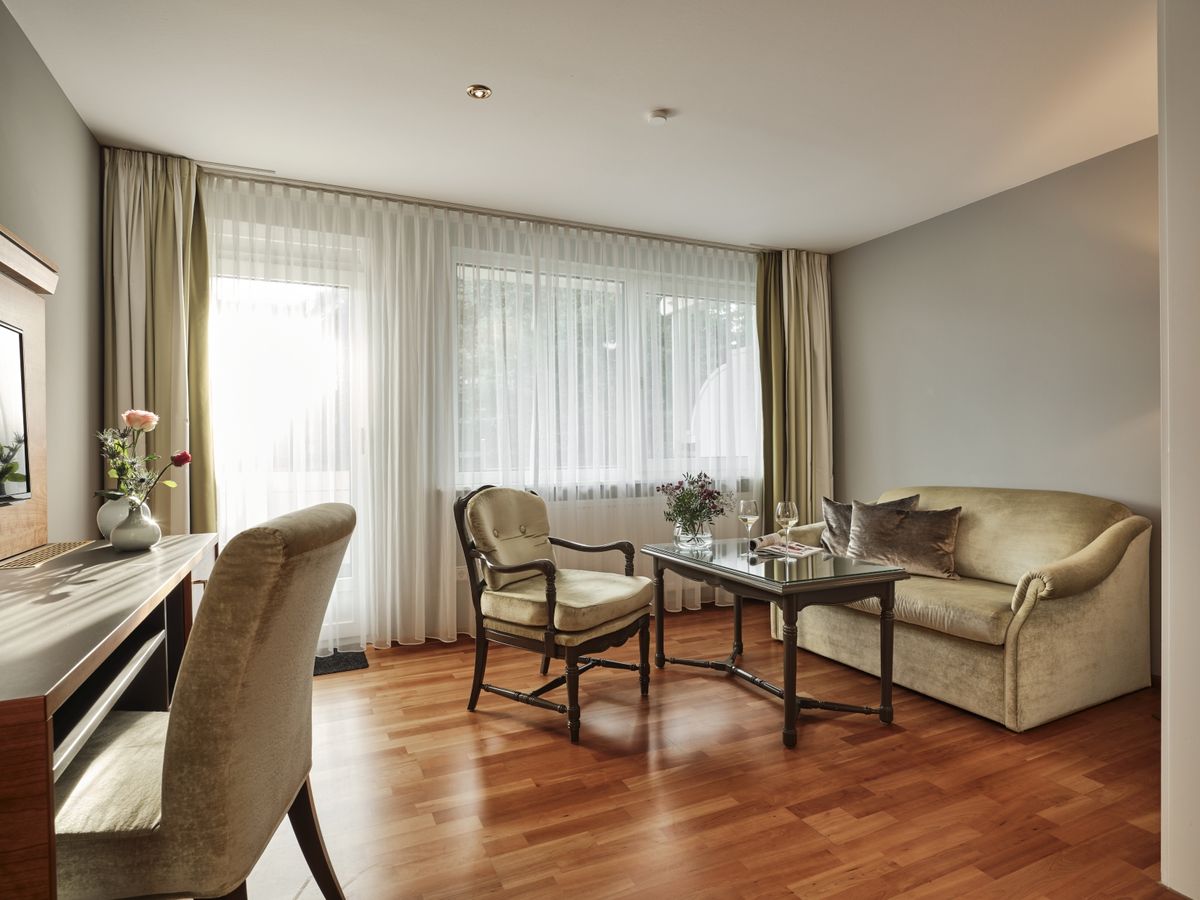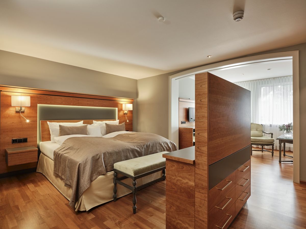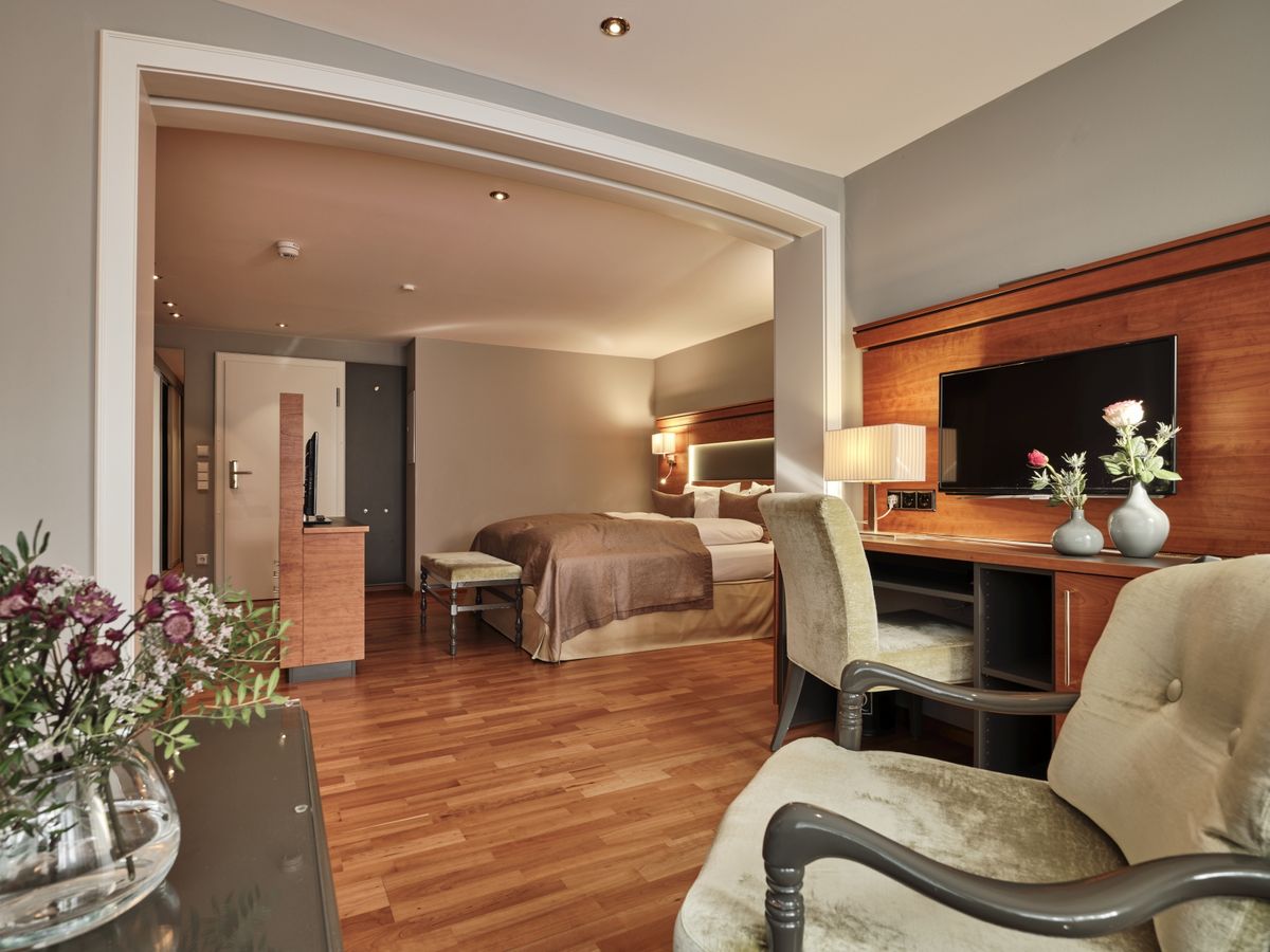 43 m² großes Doppelzimmer ist mit WC, Dusche, Doppelwaschbecken, beleuchtetem Kosmetikspiegel ausgestattet. Südbalkon, 2 Flat- Screen mit Sat-TV, Internetanschluss mit W-Lan und Lan kostenfrei, Minibar, Radio, Safe, Schreibtisch, Sitzgelegenheit, Telefon, Weckeinrichtung. Es gibt einen getrennten Wohn- und Schlafbereich. Zimmer im neuen Kirschbaumdesign, Holzboden.Keine Tiere. Bettgröße: 180 cm x 200 cm