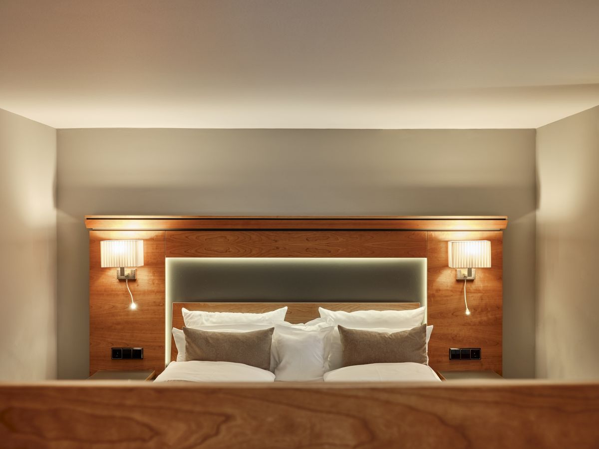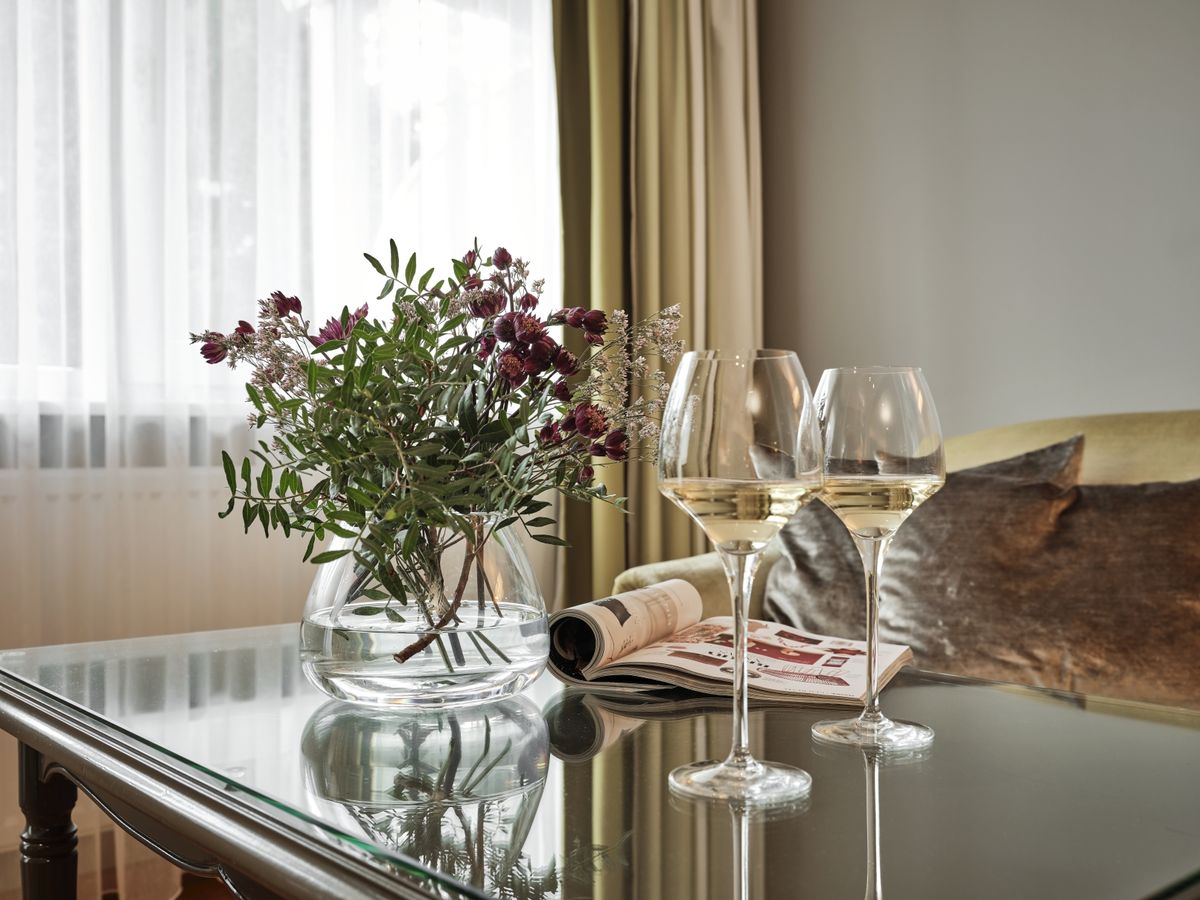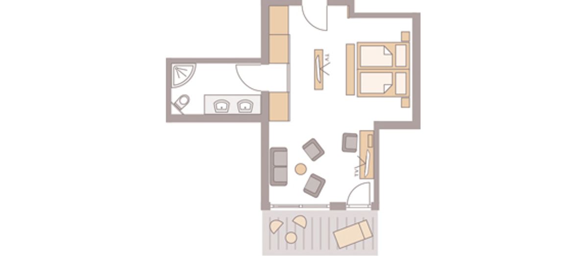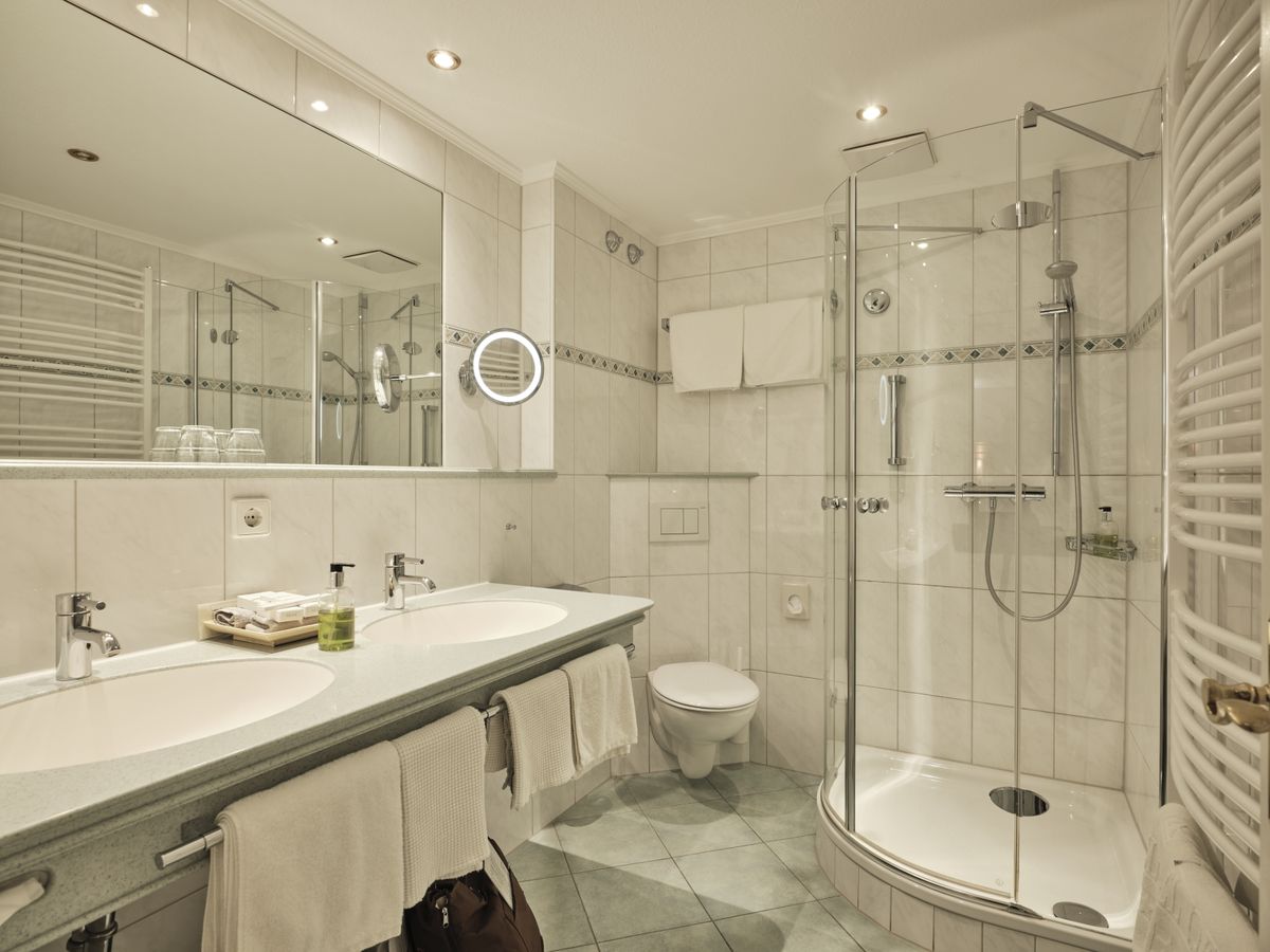 43 m² großes Doppelzimmer ist mit WC, Dusche, Doppelwaschbecken, beleuchtetem Kosmetikspiegel ausgestattet. Südbalkon, 2 Flat- Screen mit Sat-TV, Internetanschluss mit W-Lan und Lan kostenfrei, Minibar, Radio, Safe, Schreibtisch, Sitzgelegenheit, Telefon, Weckeinrichtung. Es gibt einen getrennten Wohn- und Schlafbereich. Zimmer im neuen Kirschbaumdesign, Holzboden.Keine Tiere. Bettgröße: 180 cm x 200 cm