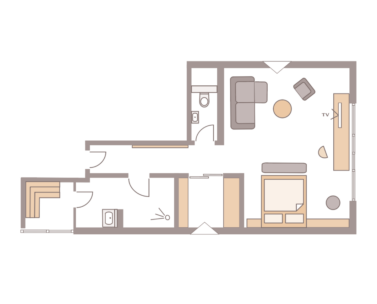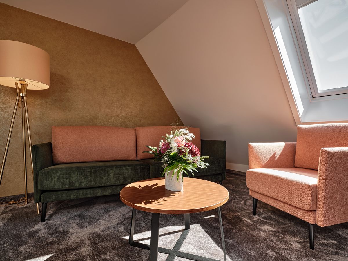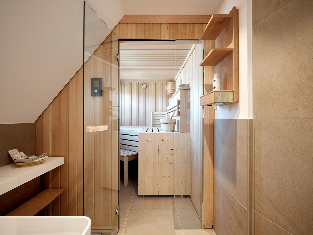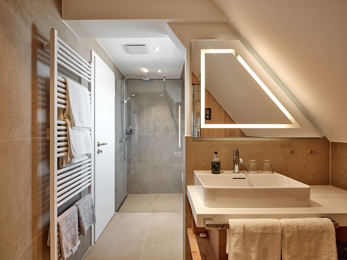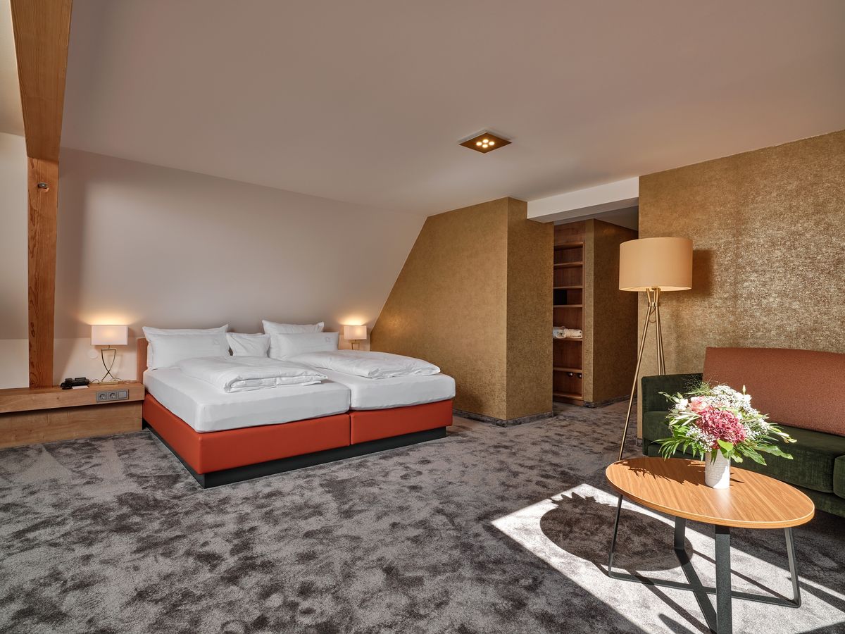 45m² großes Verwöhnzimmer mit traumhaften Blick nach Westen. Das Highlight dieses Verwöhnzimmers ist selbstverständlich die private Sauna mit Blick über Hinterzarten. Wohn- und Schlafteil in Dachschräge. Tageslichtbad mit Dusche und Sauna, WC separat. Das Zimmer ist hell und gemütlich mit modernem Teppichboden gestaltet werden. Wie all unsere Zimmer wird es mit hochwertigen Materialien ausgestattet und bietet ein Höchstmaß an Komfort. Keine Tiere